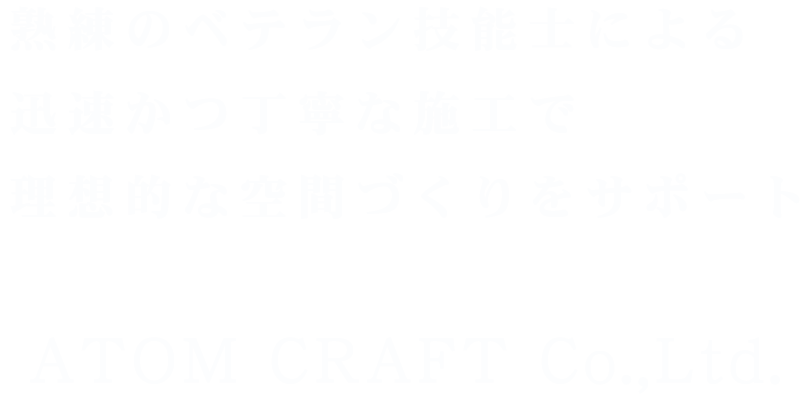 株式会社ATOM CRAFT(アトムクラフト)は、沖縄県うるま市を拠点に内装工事を専門におこなう施工店です。 アパート・マンションや戸建住宅の住空間施工をはじめ、米軍基地内の施設や住居の内装工事全般に対応しています。 新築やリフォーム・改修に関わらず、軽量下地・軽天工事、ボード施工など内装工事のことならATOM CRAFTにお任せください。